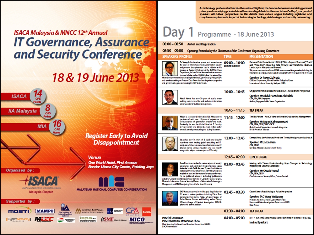 In less than three weeks (since I spoke in GIGS2013 Summit), this Big Data concern had had me involved in more direct and personal way. The Malaysian chapter of the Information Systems Audit and Control Association (ISACA) – yes, you’ve heard about their CISA and CISM professional certification, that’s their product – will hold its annual IT Governance, Assurance and Security Conference on 18-19 June 2013 in Kuala Lumpur, Malaysia.