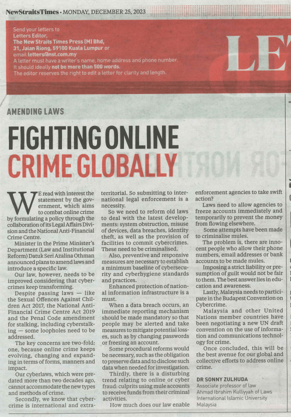 We read with interest a recent statement by the government that aims to combat online criminal activities by formulating a decisive policy through the collaboration of its Legal Affairs Division and the National Anti-Financial Crime Centre (NFCC). Minister in the Prime Minister’s Department (Law and Institutional Reform), Datuk Seri Azalina Othman, was quoted to announce plans to bring about clarity in this matter through the amendment of existing laws and introducing a new specific law (New Strait Times, 20/12/2023).